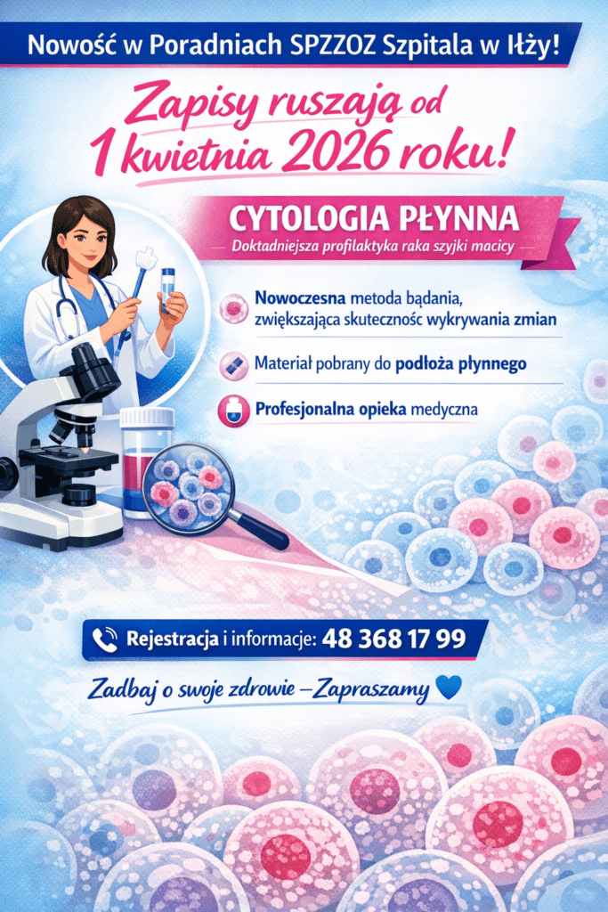 Z radością informujemy, że od 1 kwietnia 2026 roku w Poradni Ginekologiczno-Położniczej oraz w Poradni Położnej Środowiskowo-Rodzinnej SPZZOZ Szpitala w Iłży ruszają zapisy na cytologię płynną. Badanie wykonywane jest w ramach profilaktyki raka szyjki macicy, co pozwala na wczesne wykrycie zmian chorobowych i skuteczniejszą diagnostykę.