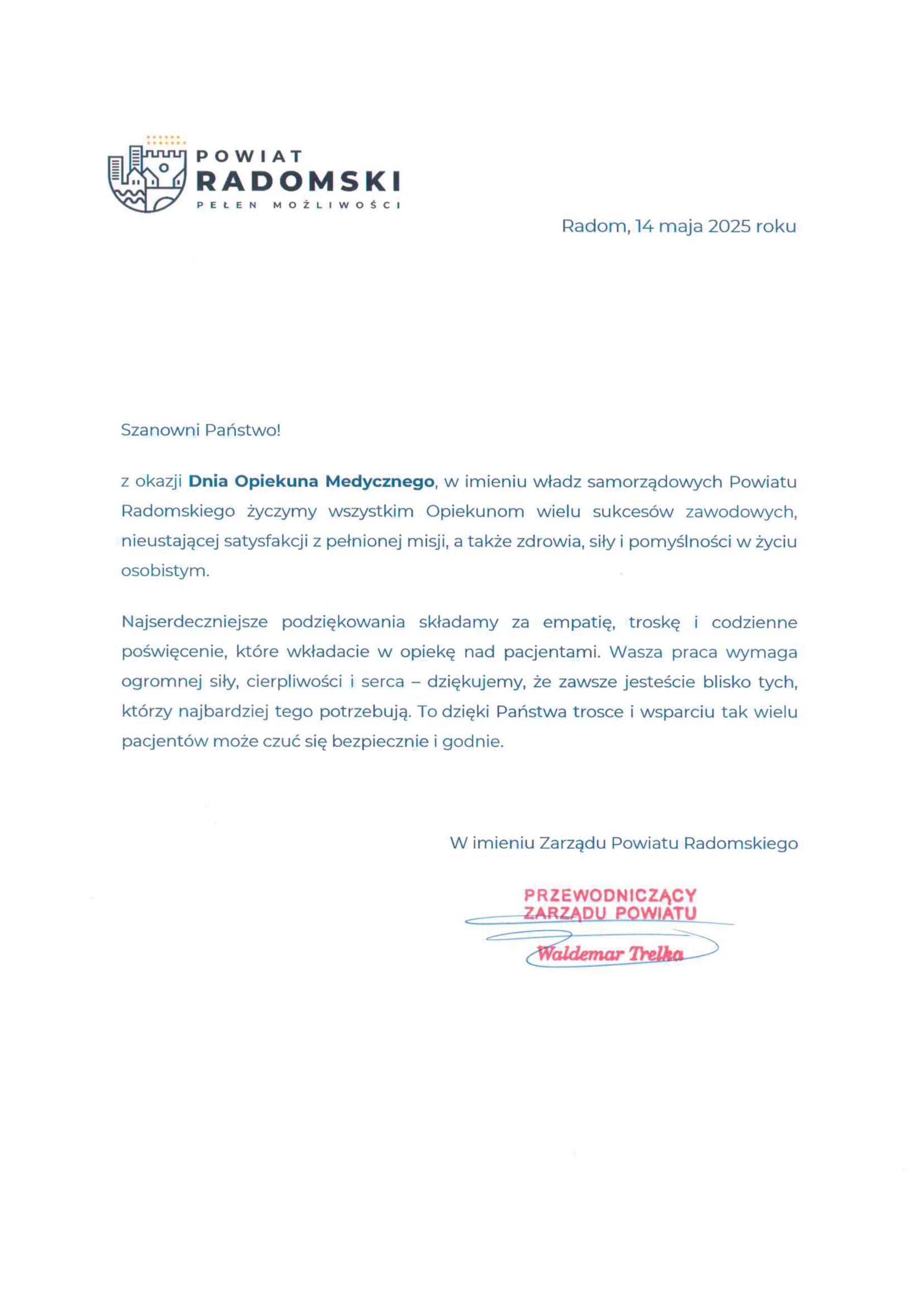z okazji Dnia Opiekuna Medycznego, w imieniu władz samorządowych Powiatu Radomskiego życzymy wszystkim Opiekunom wielu sukcesów zawodowych,